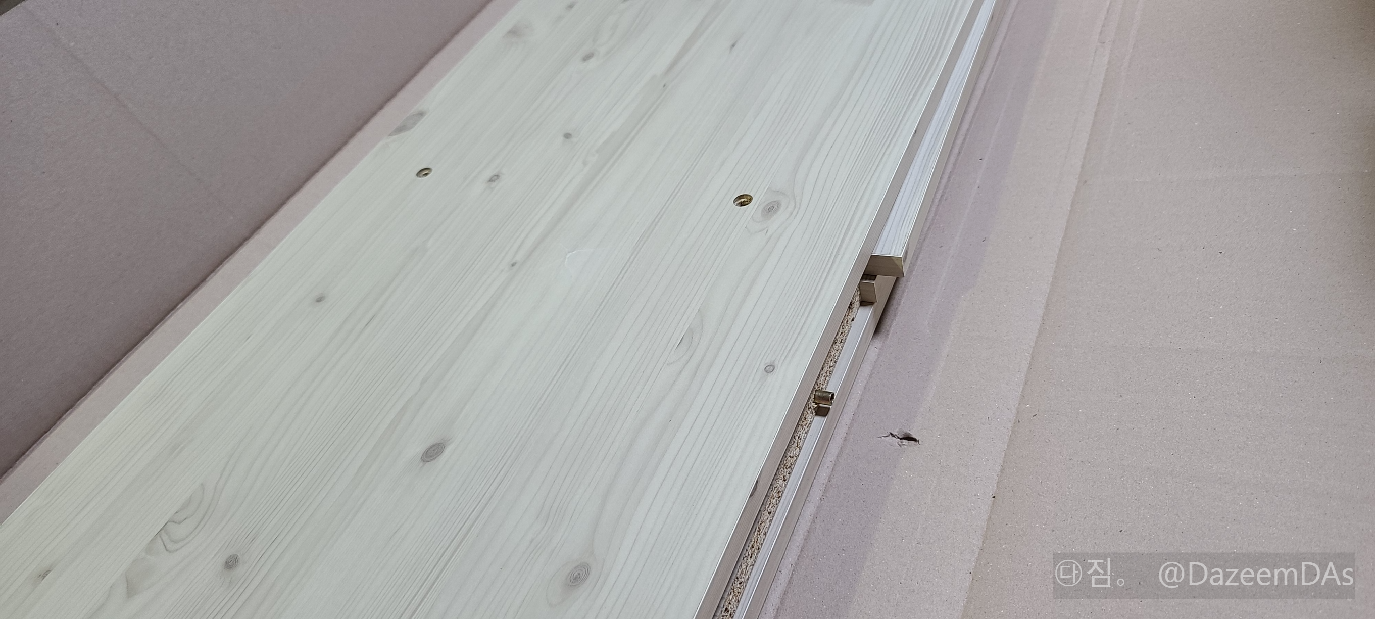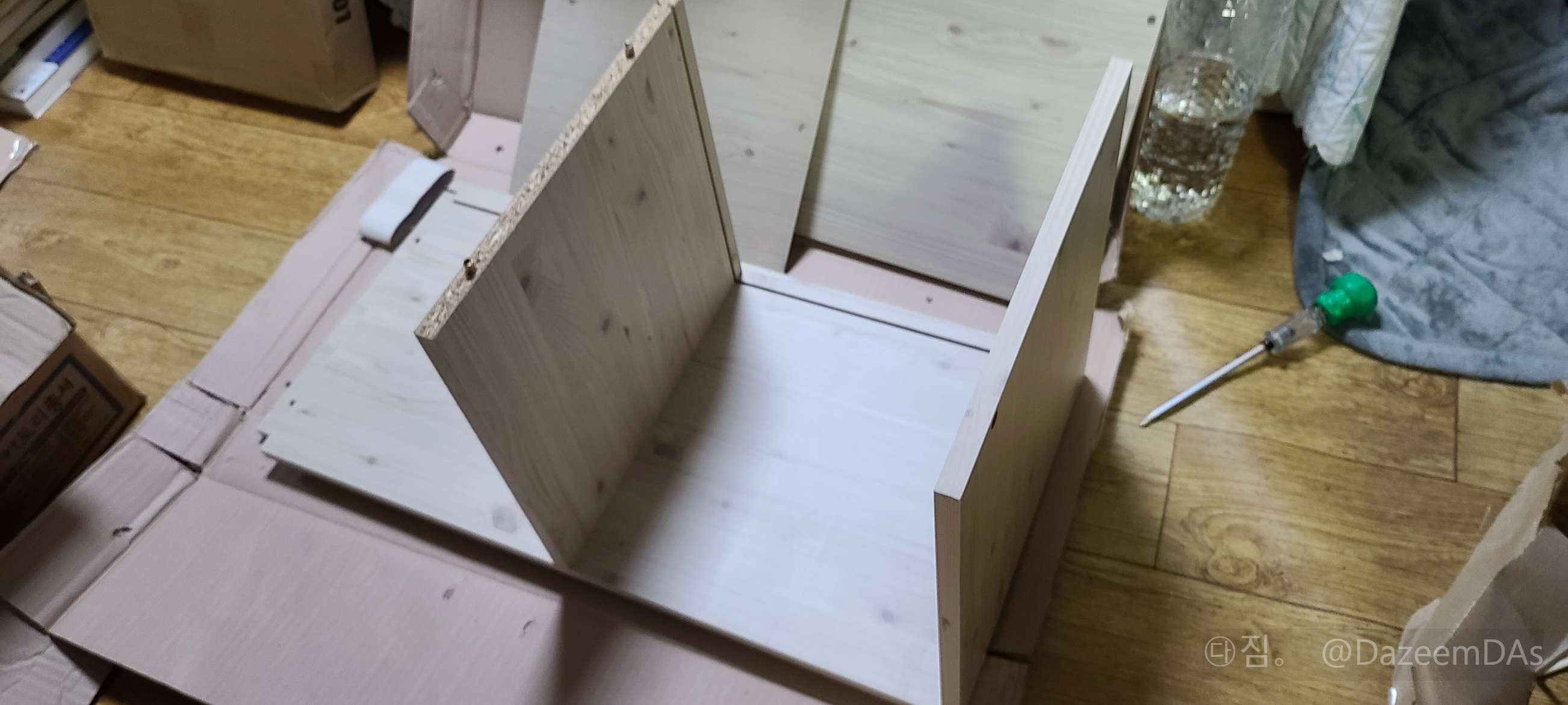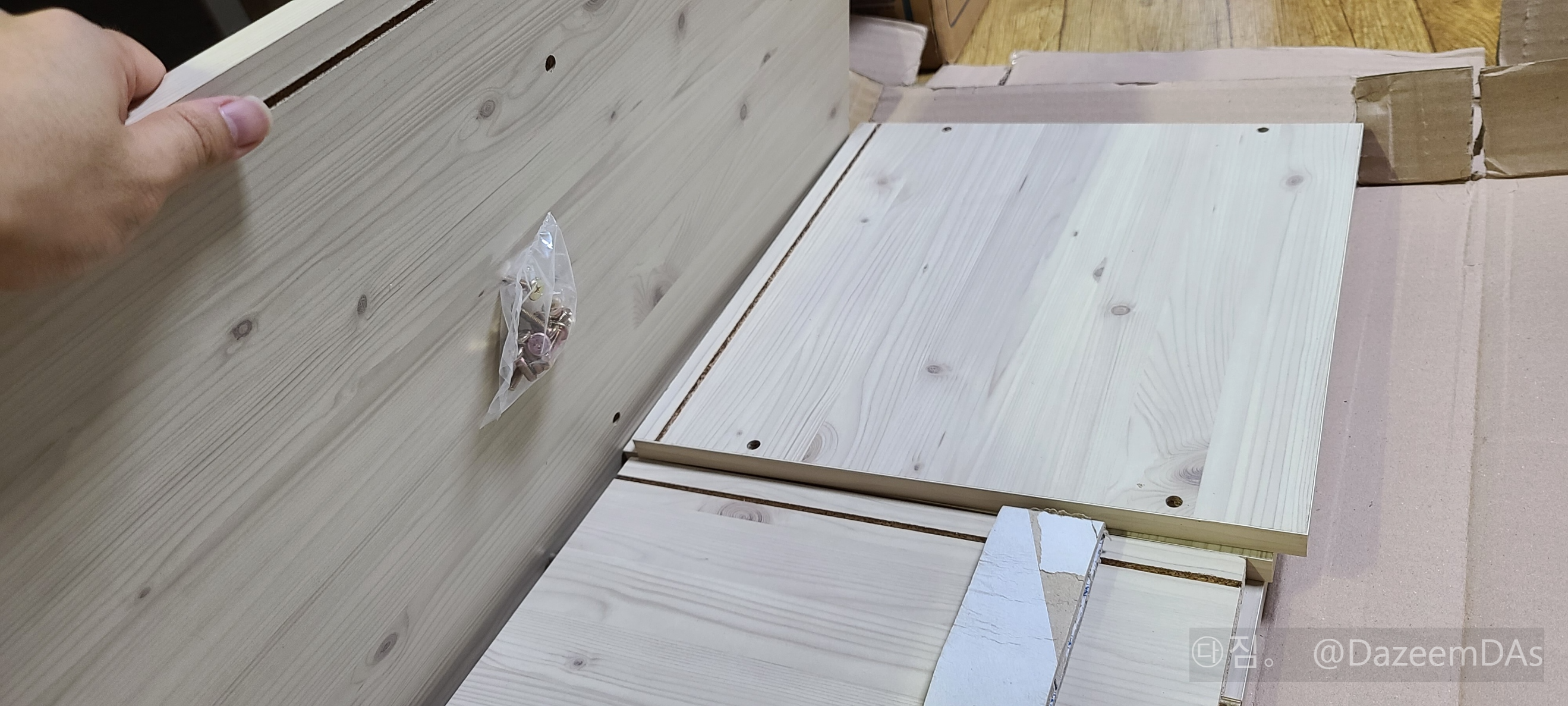 아랫판을 조립했는데.. 이 순서로 조립하면 뒷판을 못 끼우네요.