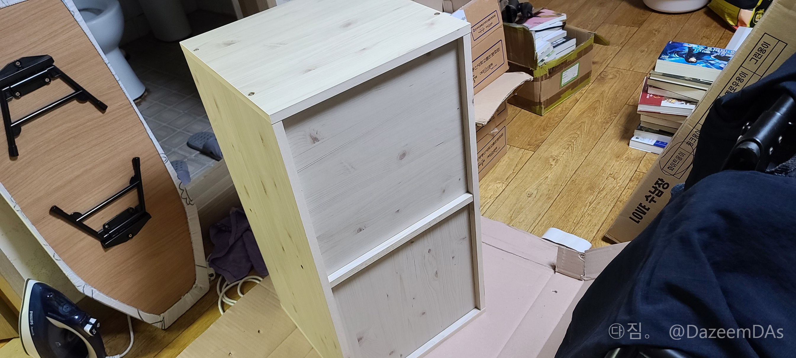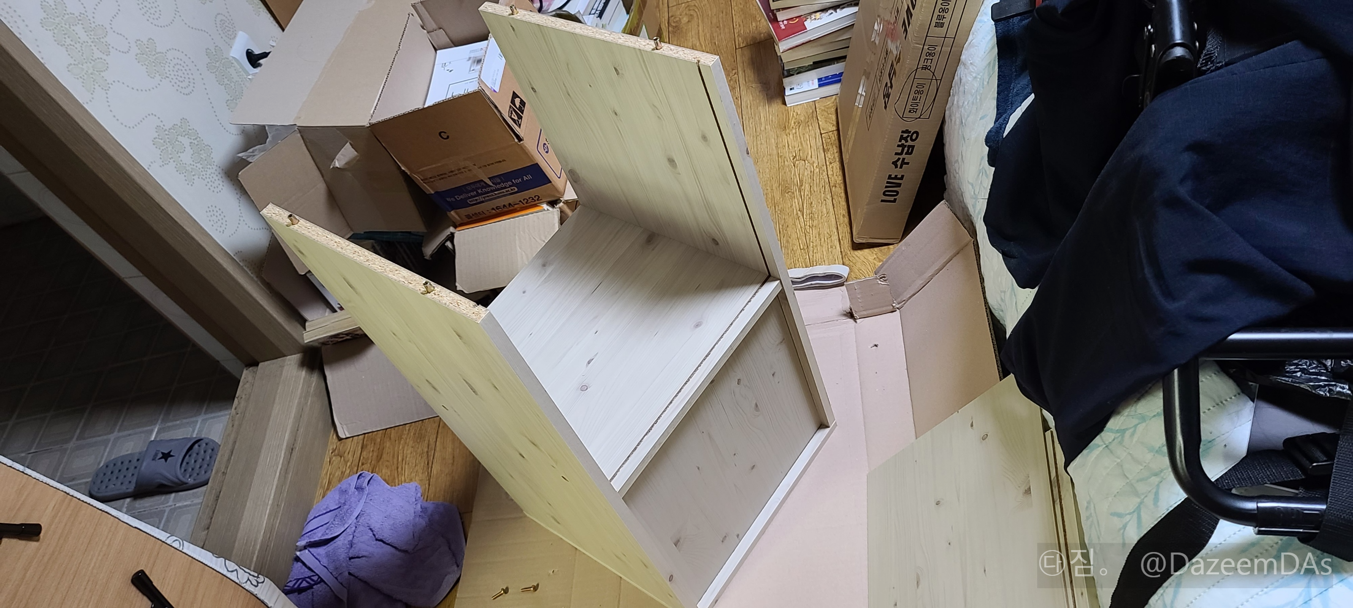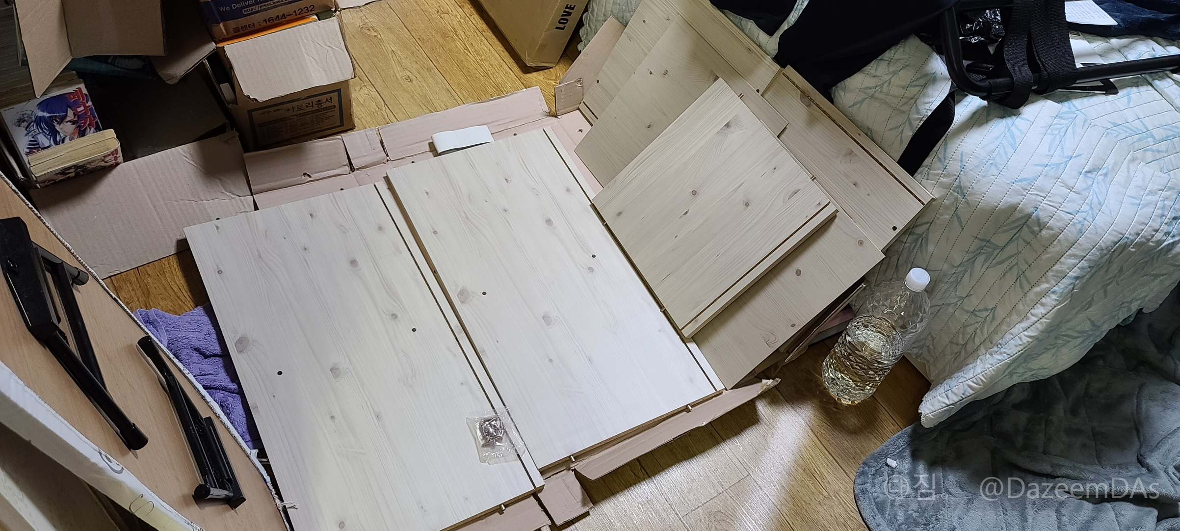 아랫판을 조립했는데.. 이 순서로 조립하면 뒷판을 못 끼우네요.