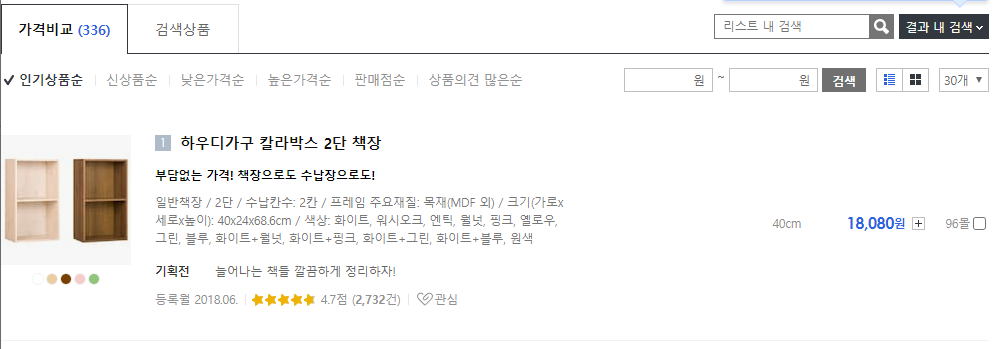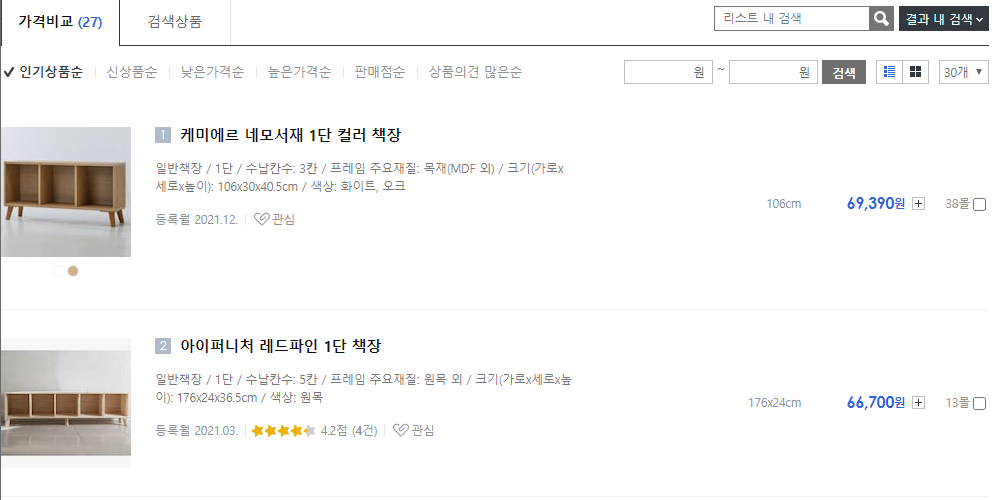 선택지가 확 늘어났습니다. 선택지가 늘었으니 추가 조건을 겁니다. 깊이(세로)가 24cm 정도로 얕은 가구가 많아서 이것도 좀 깊은 게 좋을 것 같아요. 30cm 이상으로 해봅시다.