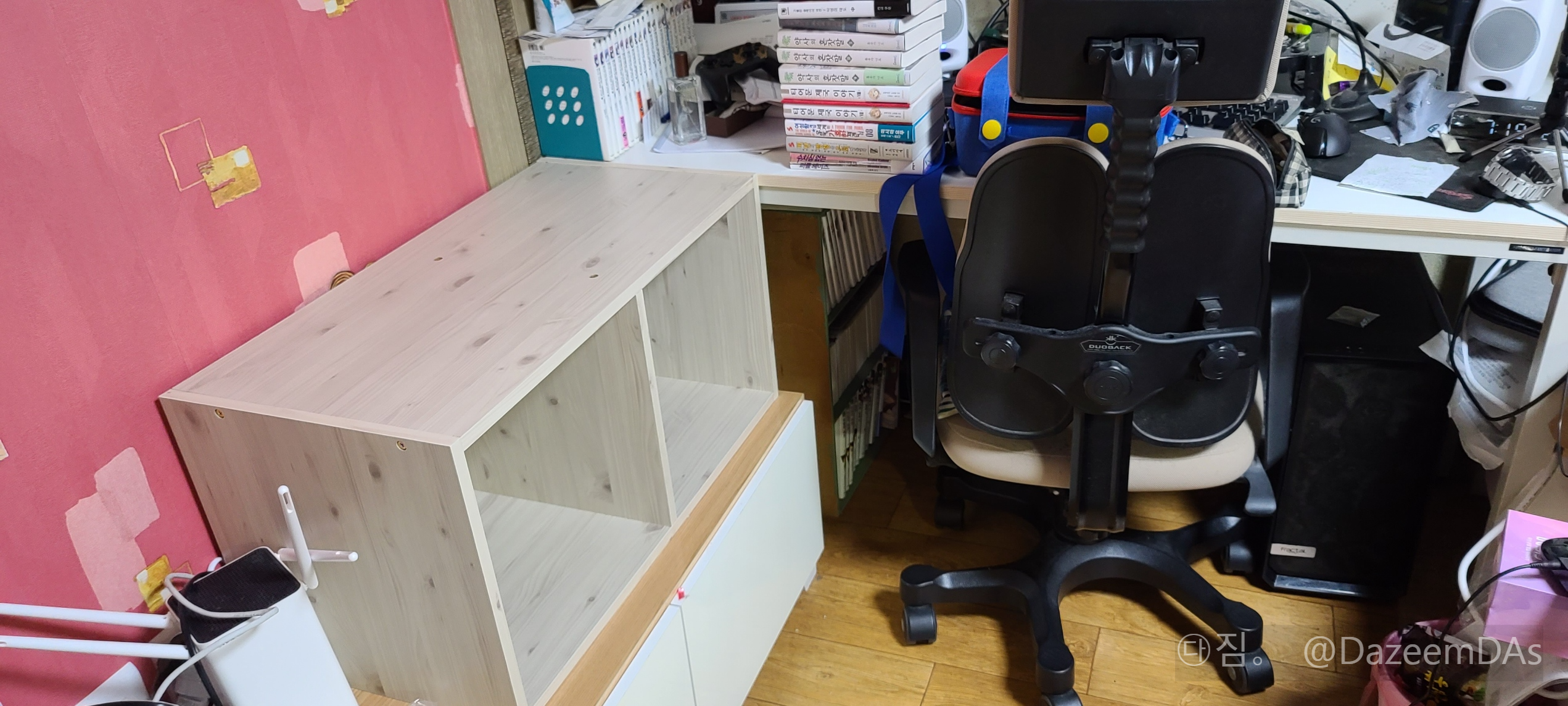 이번엔 뒷판을 하나 열어놔서 보이는 공유기랑 이것저것을 수납할 거예요!