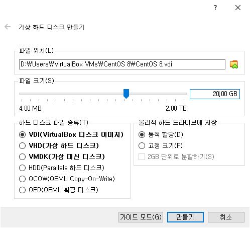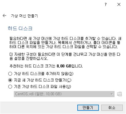 하드 디스크는 추천이 8기가바이트인데 GUI를 쓸 생각이면 절대로 추천을 믿으면 안 된다. 기본 설치 용량만으로 8기가를 좀 넘으니까 10기가 이상으로 잡고, 가능하면 20기가를 추천한다.