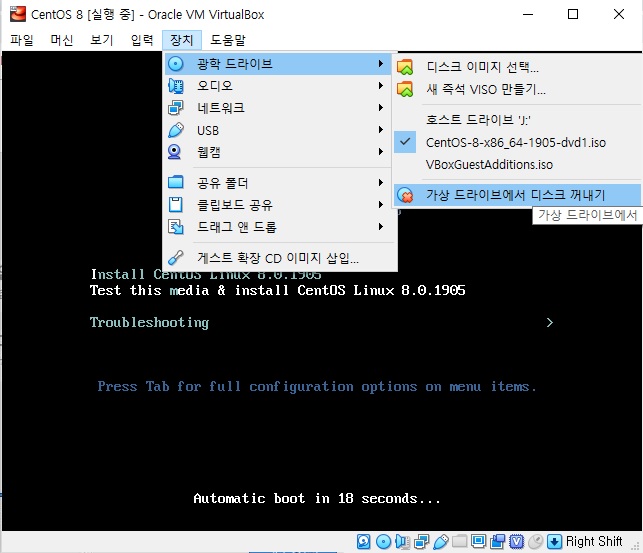 또 설치화면으로 넘어가니까 꼭 디스크를 제거하도록 하자