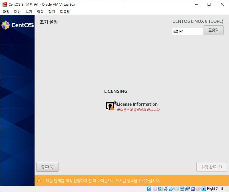 어쨌든 재부팅하면 라이센스 동의창이 뜨는데 License Information 클릭 > 약관에 동의합니다 클릭 > 설정 완료 클릭하면 계속 진행된다.