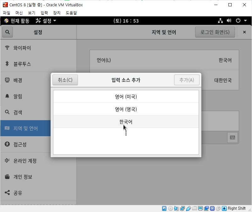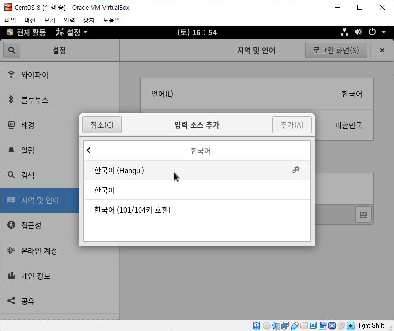 현재 활동 > 설정을 들어가던가 전원 버튼 > 도구 상자 모양 아이콘을 클릭하던가 해서 설정을 들어간 뒤에 지역 및 언어를 들어가면 입력 소스가 보이는데 저기서 + 버튼을 누른다.
