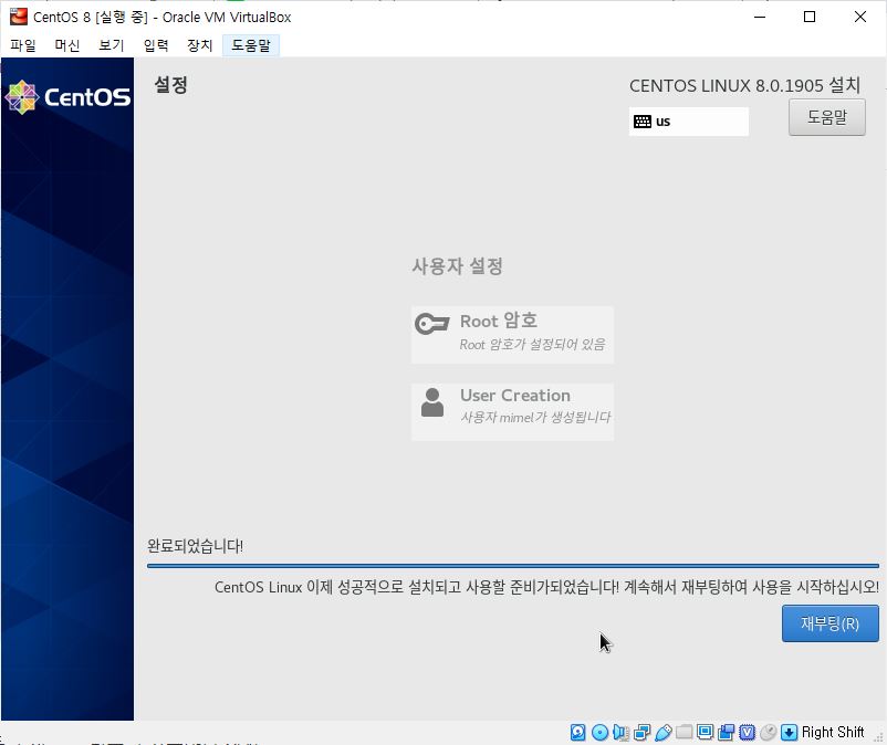 설치가 완료되었다고 뜨면 재부팅하면 될 것 같다.