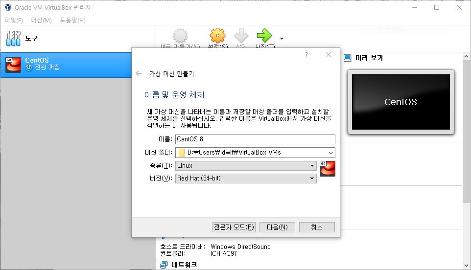 가상 머신 생성을 누르고 이름을 CentOS로 설정하면 자동으로 종류가 Linux로, 버전이 Red Hat (64-bit)로 바뀌는데 CentOS랑 레드햇은 대충 같은 거라고 봐도 될 정도로 일치하니까 이대로 다음을 누르면 된다
