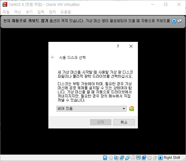 시동 디스크로 다운받은 CentOS의 iso 파일을 선택하고 시작을 누르면 설치 창이 뜨는데 1분 기다릴 거 없이 엔터 치면 진행된다.