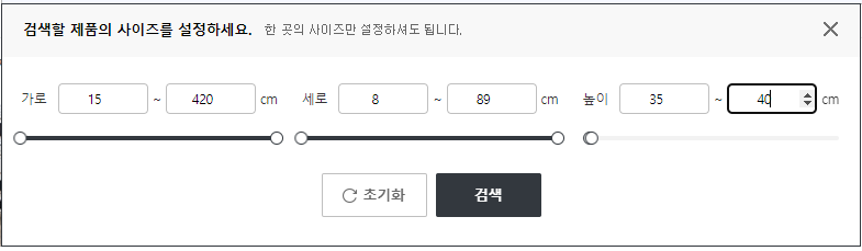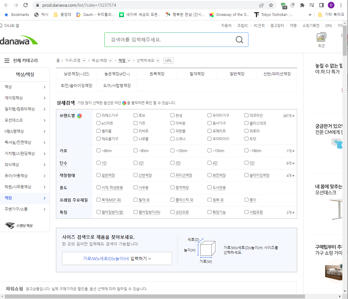 다나와에 들어가 보니 가구 사이즈 검색 기능이 있네요.